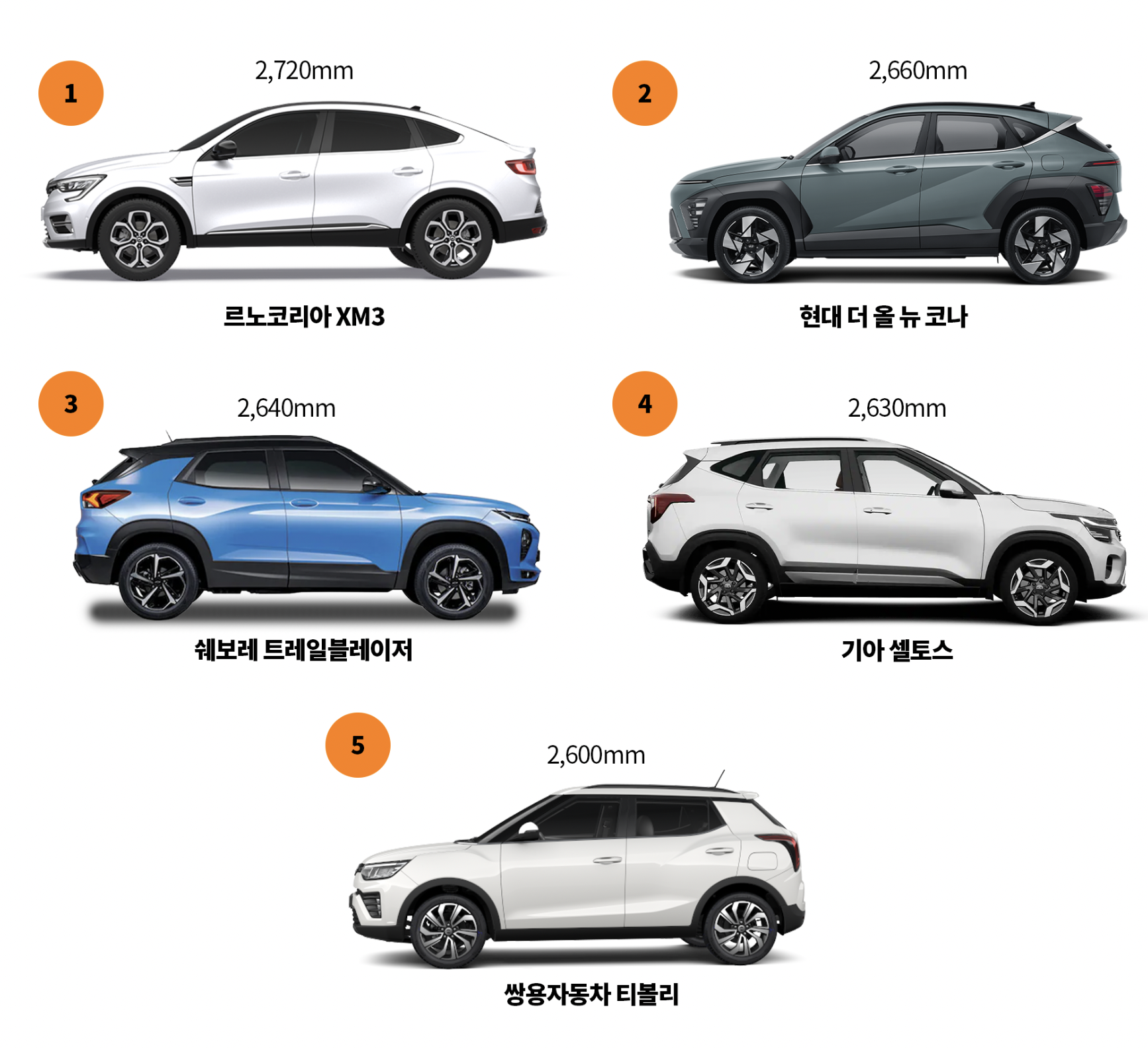 기아 셀토스가 2,630mm 로 4위